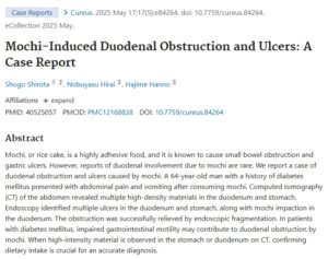 粘着性の高い“餅”が十二指腸で閉塞を起こし、潰瘍形成まで至った稀な症例を報告しています