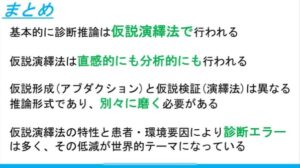 多くにケースでは診断推論は仮説演繹法で行われ、その中の第一段階の仮説形成はアブダクションで、第二段階の仮説検証は演繹法という異なる推論で行われます‼️仮説形成も演繹もテクニックがあるのでそれを学ぶことで診断推論が上達します👍
