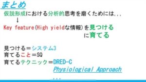 第二回目の診断学レクチャーで紹介した仮説演繹法の第一段階である仮説形成を意識的に磨くためには、患者さんの情報から診断の鍵となる情報を見抜く必要があります