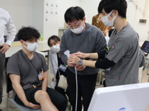 事前資料での予習を経て、当日はミニレクチャー後に即ハンズオン! 専攻医・研修医の先生が多数参加してくれました。 熱心にプローブを動かす姿が印象的。